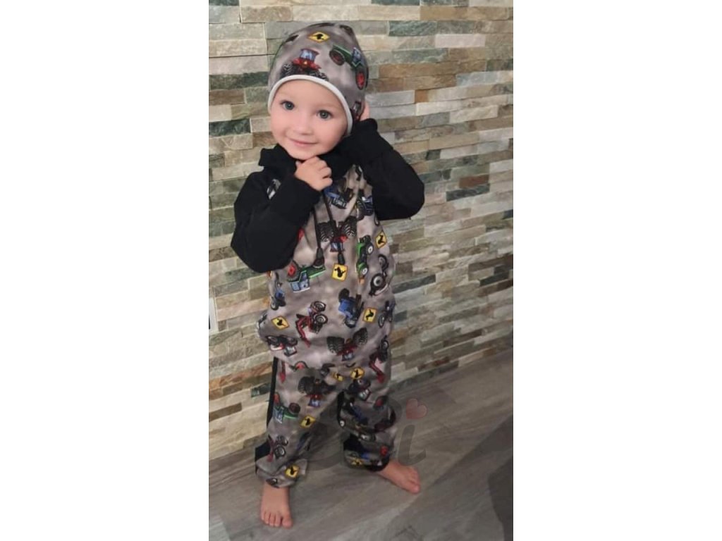 Chlapecká mikina s potiskem traktorů a s černým stojáčkem u krku.