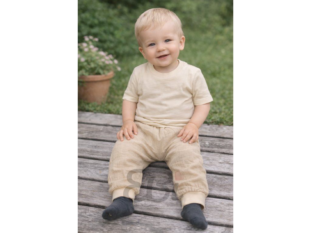 Mimi kalhoty jsou ušity s pružným lemem v pase ve kterém je klasicky navlečená guma, aby co nejlépe seděly a jsou doplněny o lemy na nohavicích.