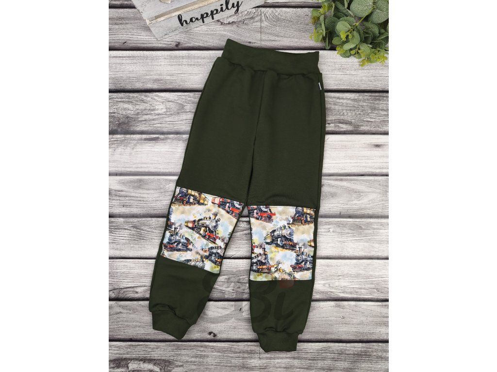 Tepláky se soft koleny - tmavě zelená, vláčky